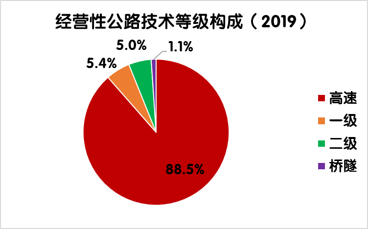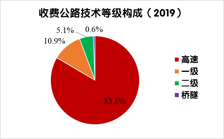 2019年末,全國收費(fèi)公路里程17.11萬公里,占公路總里程501.25萬公里的3.4%。其中,高速公路14.28萬公里,一級(jí)公路1.86萬公里,二級(jí)公路0.87萬公里,獨(dú)立橋梁及隧道1024公里,占比分別為83.5%、10.9%、5.1%和0.6%。