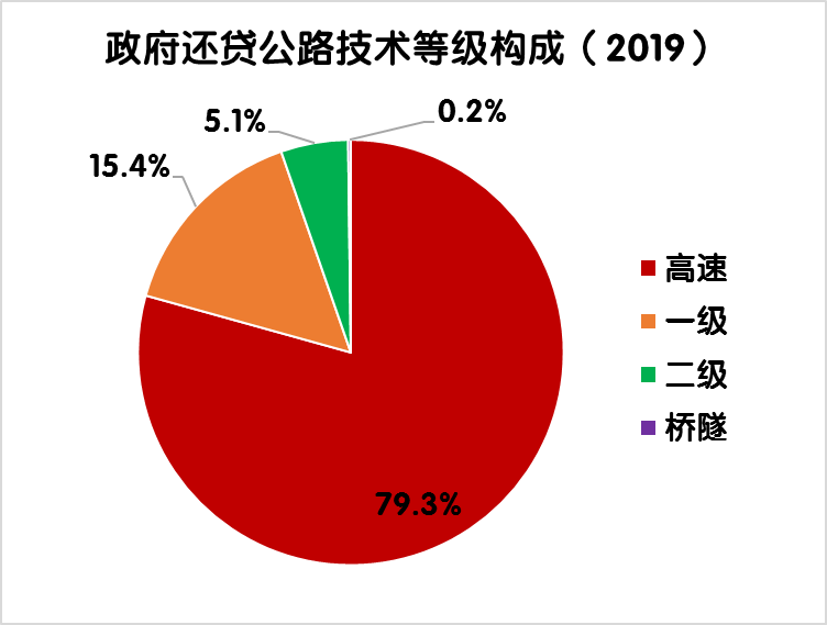 2019年末,全國政府還貸公路里程9.39萬公里,占全國收費(fèi)公路里程的54.9%。其中,政府還貸高速公路7.45萬公里,一級(jí)公路1.44萬公里,二級(jí)公路0.48萬公里,獨(dú)立橋梁及隧道186公里,占比分別為79.3%、15.4%、5.1%和0.2%。政府還貸高速公路占收費(fèi)高速公路里程的52.1%。