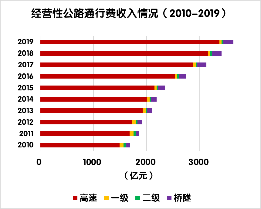 與上年相比,經(jīng)營性公路車輛通行費(fèi)總收入由3410.1億元增加到3628.9億元,凈增218.7億元,增長6.4%。其中,高速公路由3152.4億元增加到3368.1億元,凈增215.7億元,增長6.8%;一級(jí)公路由48.0億元減少到41.9億元,凈減6億元,下降12.6%;二級(jí)公路由25.4億元減少到23.5 億元,凈減1.9億元,下降7.6%;獨(dú)立橋梁及隧道由184.3億元增加到195.3億元,凈增11億元,增長6.0%。