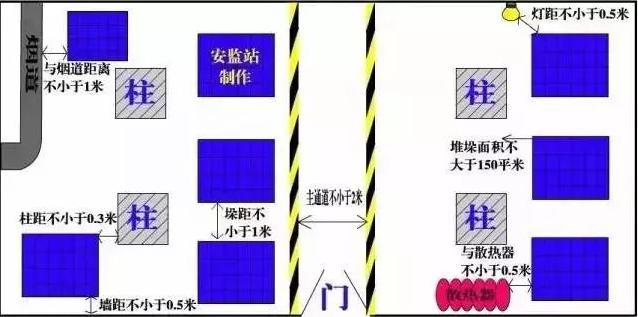 儲(chǔ)存物品與風(fēng)管、供暖管道、散熱器的距離不應(yīng)小于0.5米。與供暖機(jī)組、風(fēng)管爐、煙道之間的距離在各個(gè)方向上都不應(yīng)小于1米?!秱}儲(chǔ)場(chǎng)所消防安全管理通則》(GA1131-2014)6.14