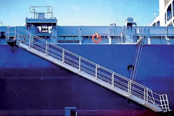 根據(jù)新生效的GB/T11701-2021《船用舷梯的基本規(guī)定》(3月1日起施行),舷梯主要分為兩類: (1)旋轉(zhuǎn)平臺(tái)式舷梯 單節(jié)舷梯、多節(jié)舷梯或伸縮舷梯的結(jié)構(gòu)與上面的旋轉(zhuǎn)平臺(tái)鉸接,可在船與登梯底面之間改變方向和傾斜角度。舷梯可用鋼絲繩或鏈從較低的(各)懸掛點(diǎn)掛住,或用固定在舷梯底部滾柱支持。 (2)固定平臺(tái)式舷梯 單節(jié)舷梯、多節(jié)舷梯或伸縮舷梯的結(jié)構(gòu)與上面的固定平臺(tái)鉸接,可在船和登梯底面之間改變傾斜角度。舷梯用鋼絲繩或鏈從較低的(各)懸掛點(diǎn)掛住,單獨(dú)使用的引航員舷梯采用此固定平臺(tái)式舷梯。 根據(jù)SOLAS第II-1章第3-9條款,凡是2010年1月1日及以后建造的船舶,必須在船上安裝經(jīng)認(rèn)可的登/離船設(shè)施,以備在港口或港口相關(guān)操作時(shí)使用。 該登/離船設(shè)施必須根據(jù)MSC.1/Circ.1331通函的要求進(jìn)行建造、測(cè)試、安裝及維護(hù),主要包括以下八點(diǎn)要求: (1)登/離船設(shè)施應(yīng)遠(yuǎn)離工作區(qū)域以及貨物或其它物體懸掛吊裝時(shí)可能通過(guò)上方的區(qū)域,該登/離船設(shè)施的目的和使用方式與引水員登 / 離船裝置是不同的; (2)應(yīng)提供足夠的照明,以照亮登/離船設(shè)施、甲板上人員登/離船和裝置控制的位置; (3)當(dāng)?shù)?離船裝置在使用時(shí),在其附近應(yīng)備有一只帶有自亮浮燈和救生浮索的救生圈(注意這里是要求一只救生圈既配備有自亮浮燈又配備有救生浮索,并且處于隨時(shí)可用狀態(tài)); (4)每部舷梯應(yīng)具有在其最大操作傾斜角時(shí),下平臺(tái)在最輕載水線以上不大于600mm的高度; (5)在每部舷梯或跳板梯的兩端應(yīng)設(shè)置一塊標(biāo)記牌,以清楚顯示安全操作和負(fù)荷限制,包括最大和最小允許設(shè)計(jì)傾斜角、設(shè)計(jì)負(fù)荷、最大底端板負(fù)荷等,如果最大操作負(fù)荷小于設(shè)計(jì)負(fù)荷,則最大操作負(fù)荷也應(yīng)顯示在標(biāo)記牌上; (6)跳板梯使用時(shí)安放水平傾斜角不應(yīng)大于30度和舷梯使用時(shí)水平傾斜角不應(yīng)大于55度; (7)在人員從登/離船設(shè)施或船舶與碼頭之間可能墜落的舷梯下應(yīng)安放安全網(wǎng); (8)正確設(shè)置舷梯下平臺(tái)的安全插銷。 收放前:應(yīng)對(duì)升降機(jī)械、鋼絲繩、滑車轉(zhuǎn)盤平臺(tái)支架等進(jìn)行檢查,確認(rèn)設(shè)備完好,鋼絲、卷筒、吊梁無(wú)障礙后方可作業(yè)。 收放過(guò)程中: (1)船靠離碼頭收放舷梯過(guò)程中,應(yīng)有專人指揮,作業(yè)人員默契配合。在浮動(dòng)的梯子上進(jìn)行收起、安裝欄桿、護(hù)繩作業(yè)時(shí),應(yīng)先檢查平臺(tái)支架是否已可靠支好,并使用止蕩索,上舷梯操作人員必須系好安全帶,穿好救生衣。 (2)舷梯落岸下踏板應(yīng)避開(kāi)障礙物,安放平穩(wěn),嚴(yán)禁扭曲。吊梁、鏈條要注意絞高或安放妥當(dāng),以免碰頭和妨礙上下船。 (3)由于潮夕、裝卸貨、碼頭環(huán)境等因素影響,舷梯不能放置碼頭時(shí),要注意隨時(shí)調(diào)整舷梯高度。當(dāng)舷梯下踏板離碼頭較高較遠(yuǎn)時(shí),不允許勉強(qiáng)上下。梯口值班人員負(fù)責(zé)調(diào)整舷梯和提醒上下人員注意安全,必要時(shí)應(yīng)按規(guī)定加裝橋梯。 (4)由于漲落潮、移泊等原因需要松緊纜繩時(shí),應(yīng)絞起舷梯,收起橋梯,或?qū)H丝春锰菘诮谷藛T上下。在無(wú)法使用舷梯時(shí),要正確地搭設(shè)橋梯,必須綁扎牢固、裝妥扶手、掛好安全網(wǎng)后人員方可上下。禁止從船舷直接跳上碼頭,或從碼頭直接跳上船。 (5)舷梯、橋梯必須按規(guī)定張掛安全網(wǎng)。舷梯、橋梯處應(yīng)有防墜落、防滑等安全指示標(biāo)志。舷梯、橋梯的扶手、扶繩、階梯必須保持清爽、干凈、牢固,便于上下人員抓牢、踏實(shí)。 (6)禁止用舷梯吊運(yùn)物品,禁止超載。