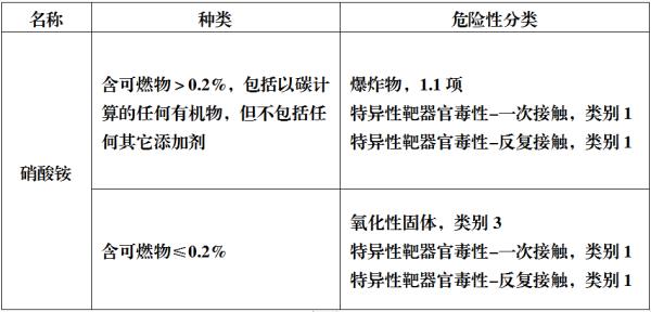 按照《危險(xiǎn)化學(xué)品目錄》(2015年),硝酸銨分為兩種,其危險(xiǎn)性分類有:
