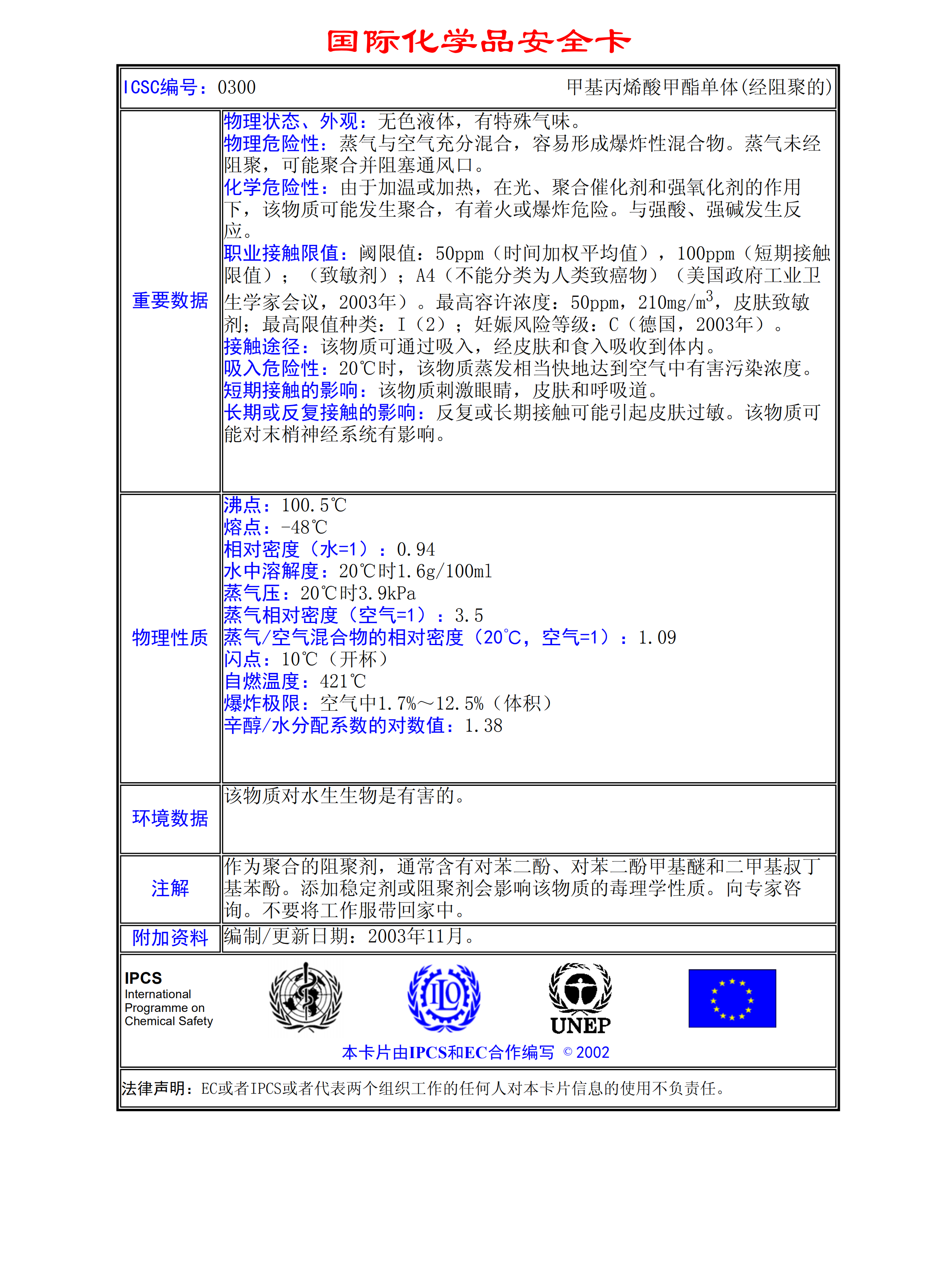 甲基丙烯酸甲酯單體(經(jīng)阻聚的)MSDS