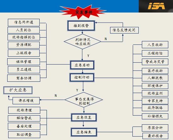 應(yīng)急反應(yīng)的流程一般按照下面執(zhí)行,但是應(yīng)急反應(yīng)講究的快速反應(yīng),前提是確保安全的條件下進行處置。