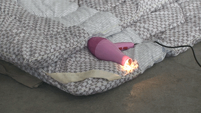 火調(diào)員在起火點(diǎn)西側(cè)位置,發(fā)現(xiàn)一個(gè)未完全過火的暖手寶,沿著暖手寶的線路在床鋪附近地面位置發(fā)現(xiàn)一個(gè)插線板,插線板上的3個(gè)插頭其中一個(gè)插頭的線路在靠近床沿中部地面處斷開。