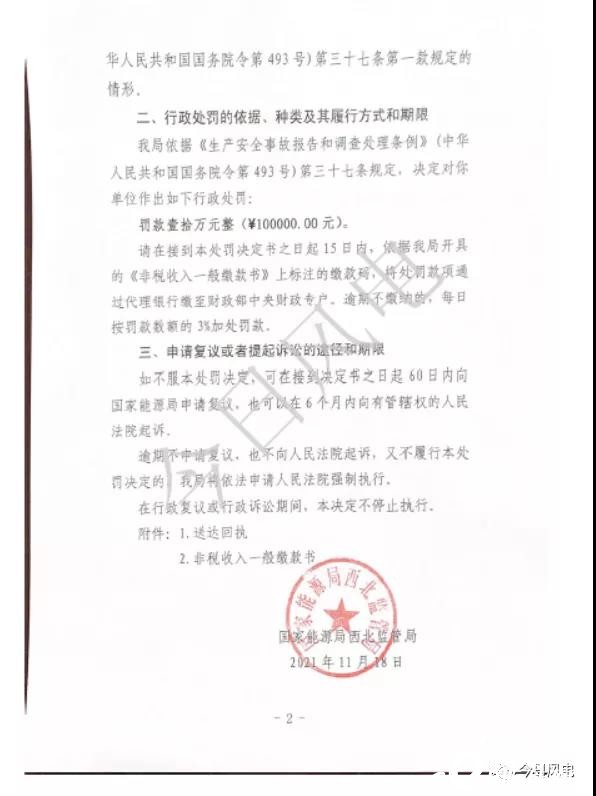 近日,國家能源局西北監(jiān)管局發(fā)布【2021】28號行政處罰決定書,根據(jù)該處罰決定,因設(shè)備管理不到位造成風(fēng)機(jī)倒塔一般設(shè)備事故,且遲報事故信息,根據(jù)《生產(chǎn)安全事故報告和調(diào)查處理?xiàng)l例》(中國人民共和國國務(wù)院令493號)第三十七條規(guī)定,對寧夏銀星能源股份有限公司鹽池風(fēng)力發(fā)電分公司罰款10萬元。