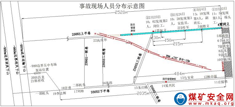 根據(jù)現(xiàn)場(chǎng)勘查和搶險(xiǎn)救援報(bào)告認(rèn)定:事故地點(diǎn)位于-810m 水平二采區(qū)南翼 2305S 工作面上平巷及三聯(lián)巷。