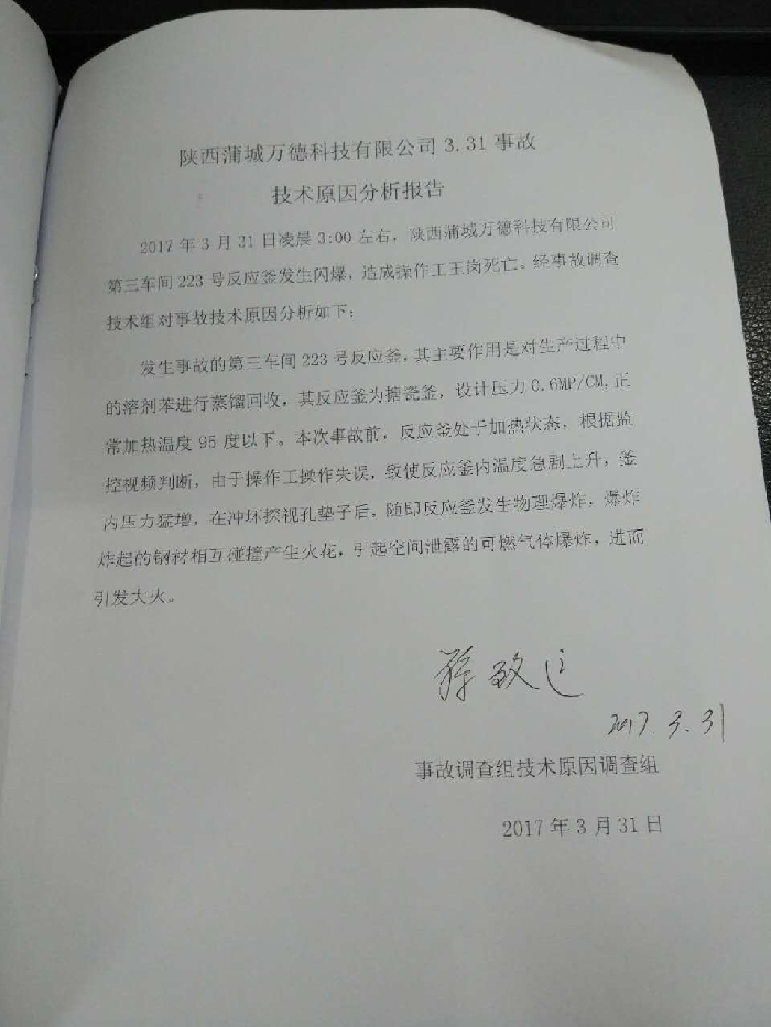 2017年3月31日凌晨3:00左右,蒲城萬(wàn)德科技有限公司第三車(chē)間223反應(yīng)釜發(fā)生閃爆,引發(fā)第三車(chē)間著火,造成一起1名夜班工人死亡。事故發(fā)生后,該公司值班領(lǐng)導(dǎo)向公司領(lǐng)導(dǎo)進(jìn)行了報(bào)告,該公司立即啟動(dòng)了《生產(chǎn)安全事故應(yīng)急救援預(yù)案》,組織工人啟動(dòng)消防水泵進(jìn)行現(xiàn)場(chǎng)救援,組織廠區(qū)其他工人撤出生產(chǎn)廠區(qū),同時(shí)向110、119、120請(qǐng)求救援,向相關(guān)政府部門(mén)進(jìn)行了報(bào)告。接到報(bào)告后,縣公安局陳莊派出所、安監(jiān)局、蒲城高新區(qū)管委會(huì)、消防大隊(duì)、120急救部門(mén)第一時(shí)間趕到現(xiàn)場(chǎng)進(jìn)行救援處置,凌晨4時(shí)20分左右成功撲滅事故現(xiàn)場(chǎng)明火。隨后該公司組織在第三車(chē)間二樓平臺(tái)找到王崗的尸體,證實(shí)該名工人在爆炸中當(dāng)場(chǎng)死亡。