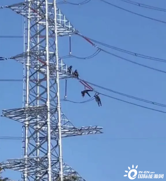 網友拍攝的視頻內容顯示,在一道路附近的高壓線桿上,兩名人員的身體懸掛在線纜上一動不動,疑似發(fā)生觸電事故,一旁則是架設的高壓電力設施。極目新聞記者注意到,兩名人員身穿黑色衣服,頭戴安全帽,因事發(fā)地位于道路交叉口,附近來往行人和車輛較多,不時有市民在一旁圍觀。