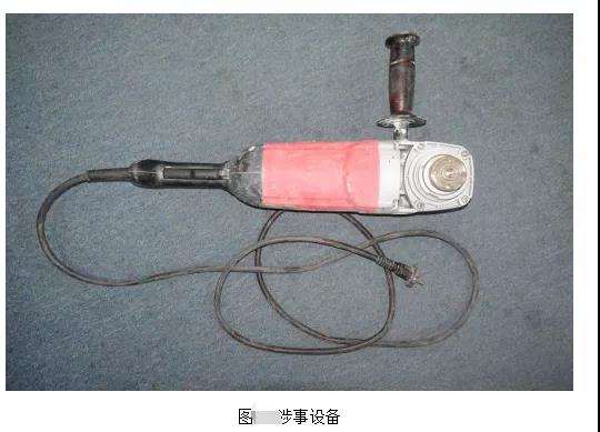 涉事設(shè)備產(chǎn)品名稱為角向磨光機(jī),所有人:彭小共,型號(hào):S1M-HL02B-180,電源電壓:220V-50Hz,額定空載轉(zhuǎn)速:8400r/min,功率:2600W,砂輪外徑:φ180mm,生產(chǎn)單位:蘇州聚匠人五金工具有限公司,銘牌處還有閱讀說(shuō)明書(shū)提示標(biāo)識(shí)和佩戴護(hù)目鏡提示標(biāo)識(shí),測(cè)得涉事設(shè)備的砂輪片安裝軸直徑為φ25.4mm。涉事設(shè)備的前端部位為金屬材質(zhì),其余部位均為塑料材質(zhì)。