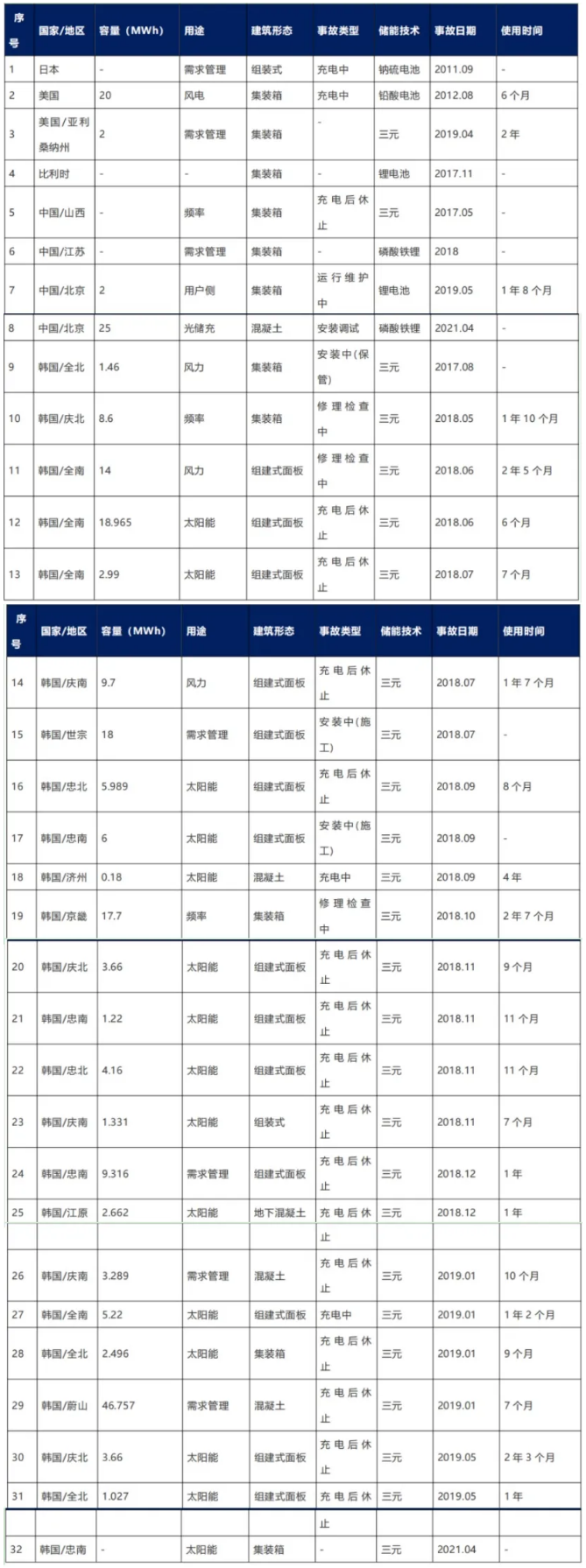 近10年間,全球共發(fā)生32起儲能電站起火爆炸事故。其中,日本1起、美國2起、比利時1起、中國3起、韓國24起。通過對行業(yè)公開信息進(jìn)行搜集整理,匯總了2011-2021年間,全球儲能項目主要火災(zāi)或爆炸事故。由于較多安全事故原因復(fù)雜,相關(guān)事件很多都未公開披露。
