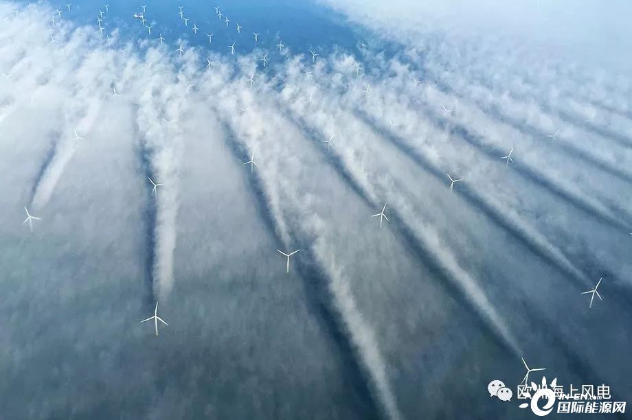 Horns Rev 1是全球第一座商業(yè)化規(guī)模的海上風(fēng)場,最早由沃旭開發(fā),安裝了80臺2MW Vestas風(fēng)機,葉輪直徑80米,輪轂高度80米,總裝機160MW。場址所在位置風(fēng)功率密度398W / m2,最遠離岸距離18公里,最大水深14米。下圖這張顯示風(fēng)機尾流影響的著名照片就來自于這座風(fēng)場。
