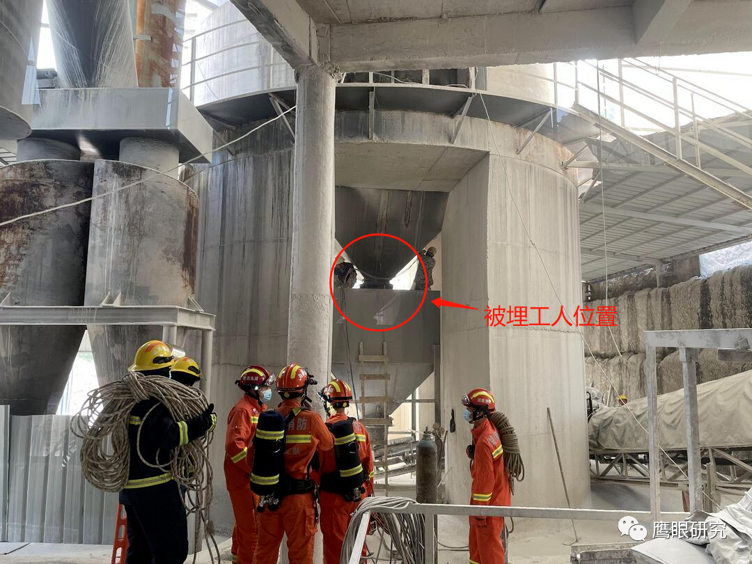 事發(fā)時(shí),被困工人發(fā)現(xiàn)石灰斗罐下料口被堵塞,便進(jìn)入斗罐底部開展疏通工作,罐壁四周的石灰塊突然崩塌,造成該工人當(dāng)場(chǎng)被石灰料埋壓,埋壓深度約1.7米。